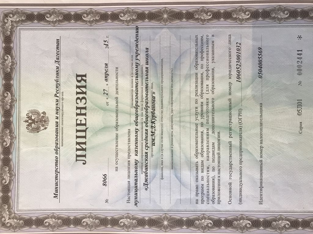 Полное наименование образовательной организации* Муниципальное казенное образовательное учреждение «Джабинская средняя общеобразовательная школа им. М.Д. Курбанова»